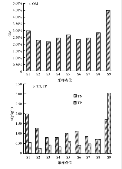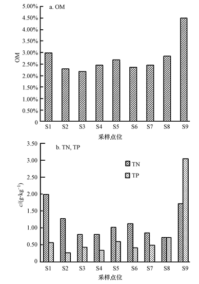 各樣點(diǎn)OM含量變化范圍在0.955%~5.598%,S9測得最大值為4.51%,差異極顯著(p<0.01).各樣點(diǎn)TN含量變化范圍在0.59~1.73 g · kg-1,平均值為1.15 g · kg-1,差異極顯著(p<0.01).各樣點(diǎn)TP含量變化范圍在0.27~3.06 g · kg-1,平均值為0.77 g · kg-1,有顯著差異(p<0.05).