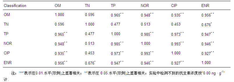 本研究中(表 1和表 2),3種FQs與OM、TP間呈極顯著正相關(guān).S9點(diǎn)位OM含量最高,沉積物中的OM蘊(yùn)含物質(zhì)復(fù)雜多元,F(xiàn)Qs進(jìn)入水體后會(huì)迅速被吸附,因此S9點(diǎn)位測得的3種FQs也最高,這與張勁強(qiáng)等的研究也相符合.Carrasquillo認(rèn)為FQs有很強(qiáng)烈的吸附固相,能夠強(qiáng)烈吸附在顆粒物和沉積物中(Carrasquillo et al., 2008),可見FQs與沉積物間的相互吸附作用強(qiáng)烈,也可以解釋FQs在沉積物中含量高的原因.