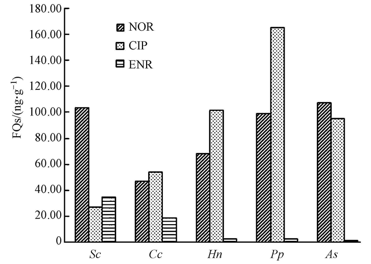 從圖 3可見,5種魚肉中均檢測出了NOR、CIP、ENR的存在.Cc、Hn和Pp魚肉中檢測到CIP>NOR>ENR,As、Sc魚肉中檢測到NOR>CIP>ENR,5種魚肉中ENR的含量相對(duì)低于NOR及CIP的含量.As魚肉中NOR含量最高為106.85 ng · g-1,Pp魚肉CIP含量最高為165.15 ng · g-1.