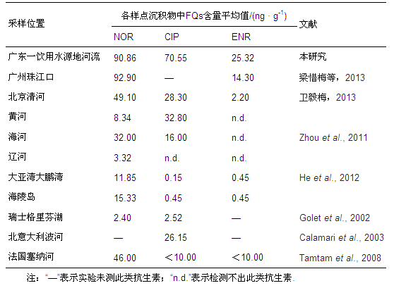 將本研究結(jié)果與目前國內(nèi)外河流沉積物中FQs的含量進(jìn)行比較,見表 3.
