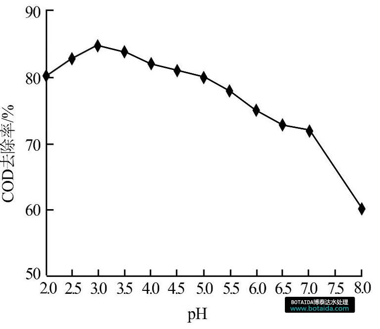 由圖4可以看出,在酸性條件下,隨pH的增加,廢水COD去除率增加,在pH=3.0時有最佳效果。當pH小于3.0時,鐵屑與酸反應(yīng)生成的氫氣大量覆蓋在鐵屑的表面,減小了鐵屑的有效表面積,降低了原電池效應(yīng),從而使處理效果下降。而且溶液pH過低,會破壞絮凝體,使溶液因Fe2++和Fe3++濃度增大而色度增加。當pH大于3.0時,H+濃度逐漸降低,陰極的反應(yīng)效果也下降。所以選擇適宜的進水pH為3.0。