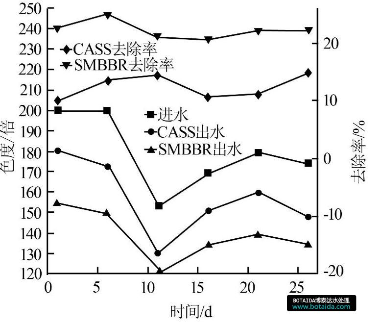 圖5 CASS和SMBBR工藝對(duì)色度的去除效果