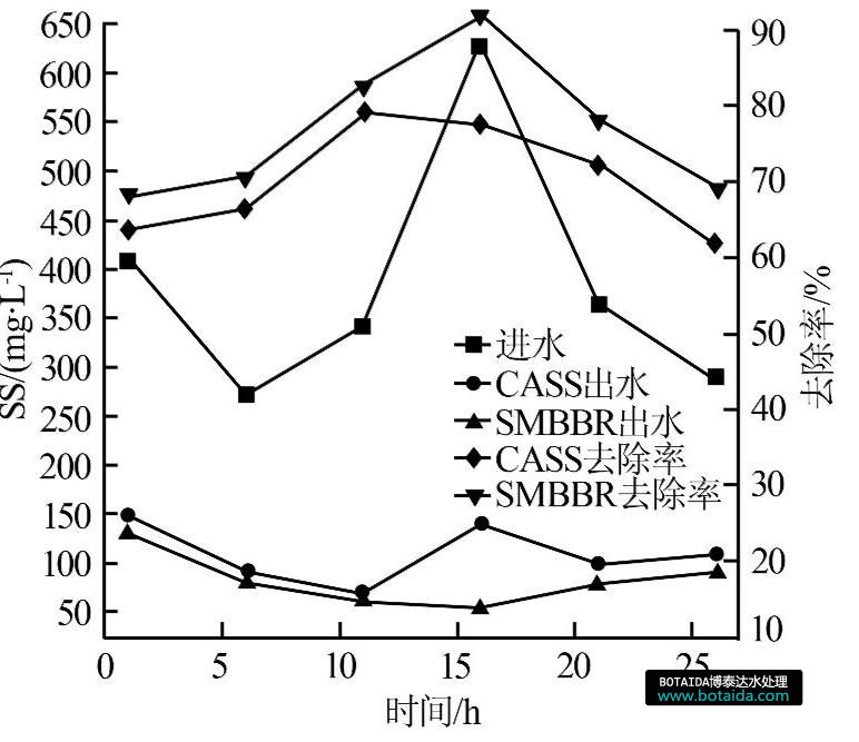 圖6 CASS和SMBBR工藝對(duì)SS的去除效果