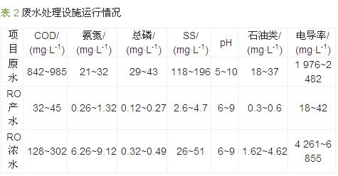 脫脂廢水、磷化廢水、噴漆廢水和電泳廢水等機械加工廢水的有機物濃度較高,且含有礦物油、懸浮物和氮磷等污染物。通過氣浮和混凝沉淀處理可將COD降低到700 mg/L左右,生物系統(tǒng)(缺氧和好氧工藝)可將COD降低到70 mg/L左右,出水可穩(wěn)定達標排放。實際運行時首先投加NaOH將廢水pH調(diào)至8.5~9.0,然后按照3、5、1.0 mL/L的投加量分別加入5%(質(zhì)量分數(shù),下同)的CaCl2溶液、10%的聚合氯化鋁和5%的聚丙烯酰胺溶液,混合反應(yīng)60 min后進入氣浮池,氣浮出水按6、1.5 mL/L投加量分別投加10%的聚合氯化鋁和5%的聚丙烯酰胺溶液,混凝沉淀出水最后進入生物處理系統(tǒng),生化出水經(jīng)砂濾器、炭濾器、超濾、保安過濾器和反滲透深度處理后回用于生產(chǎn),反滲透濃水可達到GB 8978—1996三級標準。該工程已穩(wěn)定運行4 a多,從實際檢測結(jié)果來看,反滲透產(chǎn)水COD穩(wěn)定在32~45 mg/L,電導(dǎo)率穩(wěn)定在18~42 μS/cm,可滿足生產(chǎn)用水水質(zhì)要求;反滲透濃水COD穩(wěn)定在128~302 mg/L,SS穩(wěn)定在26~51 mg/L,達到GB 8978—1996三級標準后達標排放,其主要水質(zhì)指標如表 2所示。