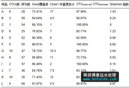 9個污水處理廠,共12個樣品,構建12個ppk1基因克隆文庫進行分析.12個克隆文庫的Good 覆蓋率、Chao1 豐富度估計、OTU 值與估計的 Chao1 值之比(OTUobserved/OTUestimated)、香農指數見表 4.12個污泥樣品的ppk1基因的OTUs分布如圖 3所示.如表 4所示,12個樣品的Good覆蓋率變化范圍為71.43%~98.15%.計算的 OTU 值與估計的 Chao1 值之比除了樣品A為47.06%,其余11個樣品在62%~100%之間.Mehlig等(2013)對國外8個污水處理廠進行了研究,Good覆蓋率只有35.4%~65.4%.說明本研究的12個克隆文庫可以代表 12個樣品中Accumulibacter的群落組成.樣品A可能需要測更多的數據保證數據的可信度.