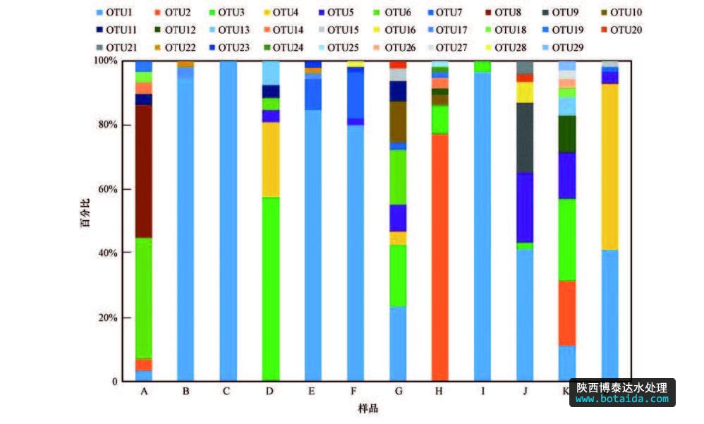 OTU1共出現12次,即每個樣品中都有序列出現在OTU1中,同時還是樣品B、C、E、F、F、I和J共6個克隆文庫中的優(yōu)勢OTUs.OTU3和OTU5在6個樣品中出現,尤其在樣品H的克隆文庫中分布廣泛.OTU7出現了4次.有4個OTUs共出現3次,分別為OTU2、OTU4、OTU6和OTU11.上述8個OTUs為Accumulibacter的主要種屬.有10個OTUs(OTU10、OTU12、OTU13、OTU15、OTU17~ OTU20、OTU22、OTU23)出現2次,有11個(OTU9、OTU10、OTU14、OTU16、OTU21、OTU24~ OTU29)共出現1次,這21個OTUs中每個OTUs包含1~2條ppk1序列,不是Accumulibacter的主要種屬.