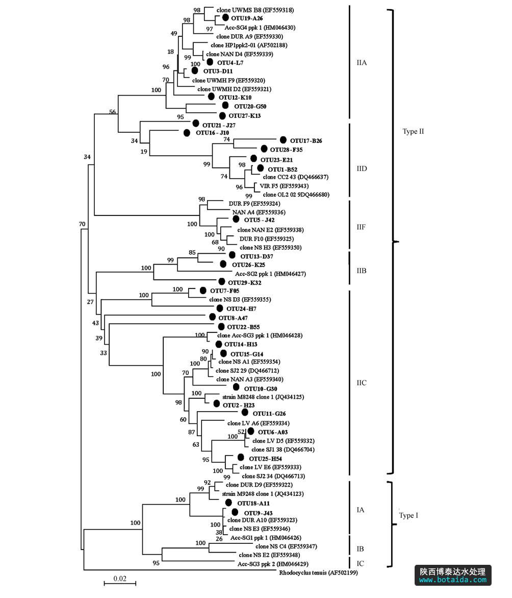 結合圖 4和圖 5可知,IIA包含6個OTUs(88條序列),IIB包含3個OTUs(6條序列),IIC包含11個OTUs(124條序列),IID包含4個OTUs(315條序列),IIF包含1個OTU(共23條序列).其中,優(yōu)勢OTUs(OTU1~OTU3)分別隸屬于IID、IIC、IIA.QPCR和PCR-Cloning-Sequencing的研究結果都證實了12種污水處理工藝中Type I豐度很低,主要以 Type II為主,且IIA、IIC、IID是系統(tǒng)中的優(yōu)勢分支.