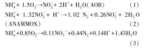 CANON(Completely Autotrophic Nitrogen Removal over Nitrite,CANON)工藝是一種新型的生物脫氮工藝,其脫氮原理為:氨氧化菌(Ammonia-Oxidizing Bacteria,AOB)利用溶解氧(Dissolved Oxygen,DO)將NH4+-N氧化成NO2--N,厭氧氨氧化菌(Anaerobic Ammonium Oxidation,ANAMMOX)利用AOB提供的基質(zhì)和創(chuàng)造的缺氧環(huán)境對(duì)NH4+-N和NO2--N進(jìn)行轉(zhuǎn)化從而實(shí)現(xiàn)脫氮.反應(yīng)過(guò)程如下: