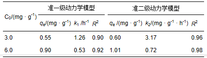 式中,qt和qe分別為t時(shí)刻和平衡態(tài)時(shí)的吸附量(mg · g-1),k1為準(zhǔn)一級(jí)吸附速率常數(shù)(h-1),k2為準(zhǔn)二級(jí)吸附速率常數(shù)(g · mg-1 · h-1).