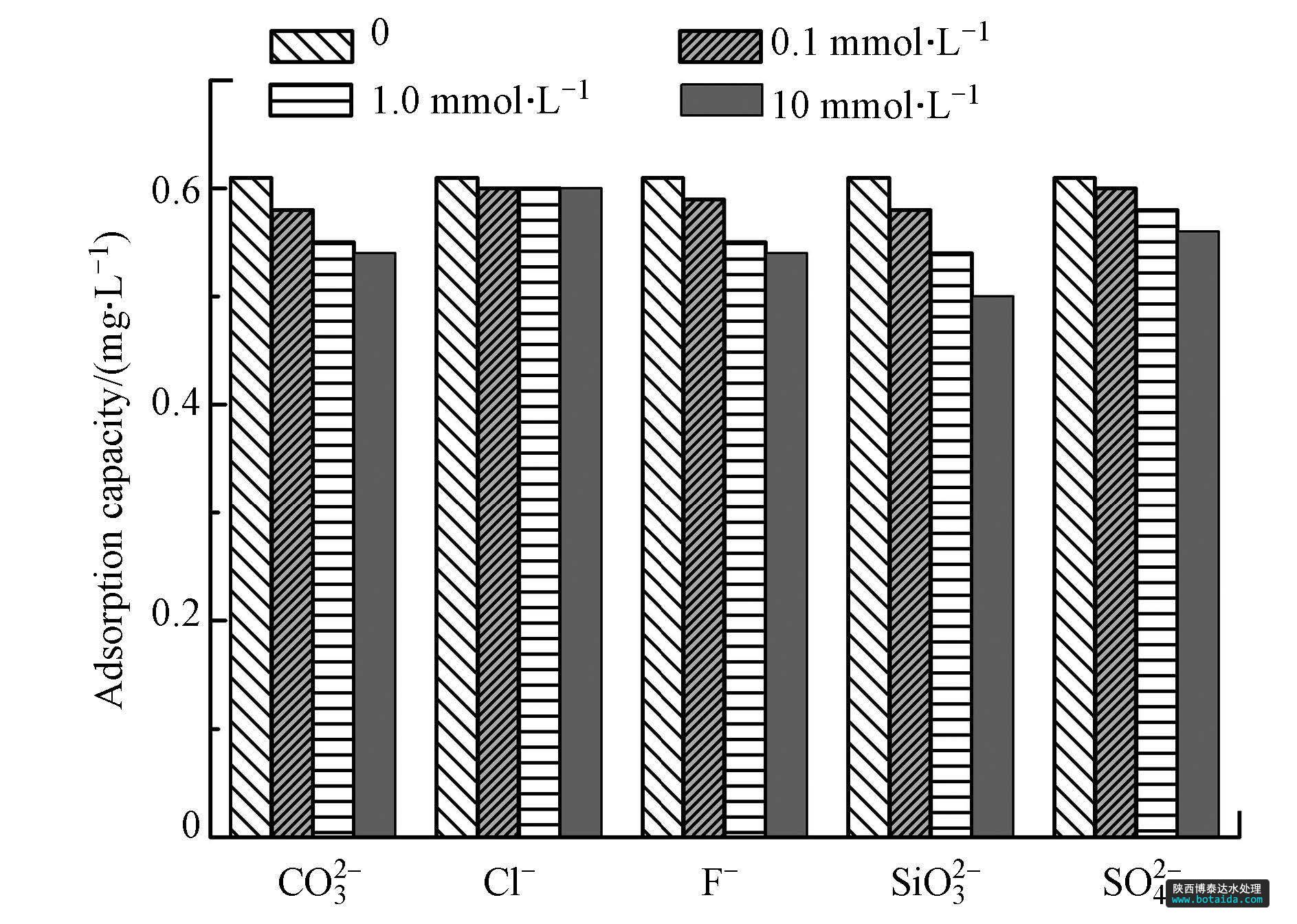 配制一系列50 mL濃度為5.0 mg · L-1磷溶液,溶液pH 7.0±0.1,分別投加200 mg吸附劑,考察Cl-、F-、CO32-、SO42-與SiO32- 5種陰離子在4種不同濃度(0 mmol · L-1,0.1 mmol · L-1,1.0 mmol · L-1,10 mmol · L-1)時(shí)對(duì)吸附磷的影響.