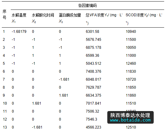 根據(jù)CCD(Central Composite Designs)中心組合試驗設(shè)計原理,在前期單因素試驗的基礎(chǔ)上,選擇水解溫度、水解酸化時間和蛋白酶投加量作為自變量,分別用X1、X2、X3表示,以總VFA濃度和SCOD濃度作為響應(yīng)值,分別用Y1、Y2表示,進行響應(yīng)面試驗因素水平安排,具體見表 1.由Design Expert 8.0.6(Stat-Ease),采用CCD試驗設(shè)計原理,得到3因素3水平共20個試驗點的試驗方案,并對試驗數(shù)據(jù)進行二次多元回歸擬合.二次多元回歸方程為: