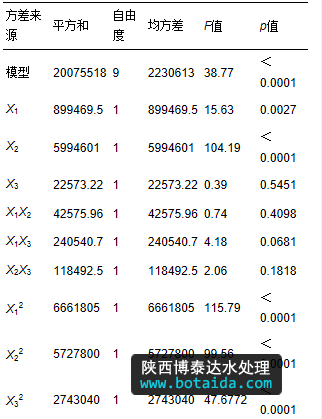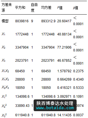 式中,Y為響應(yīng)值;X1、X2、X3為自變量編碼值;B0為常數(shù)項;B1、B2、B3為線性系數(shù);B12、B13、B23為交叉項系數(shù);B11、B22、B33為二次項系數(shù);e為誤差. 對模型進行方差分析,并通過模型得到基于微波-過氧化氫-堿預(yù)處理的污泥水解酸化的優(yōu)化工藝條件和最大總VFA濃度.
