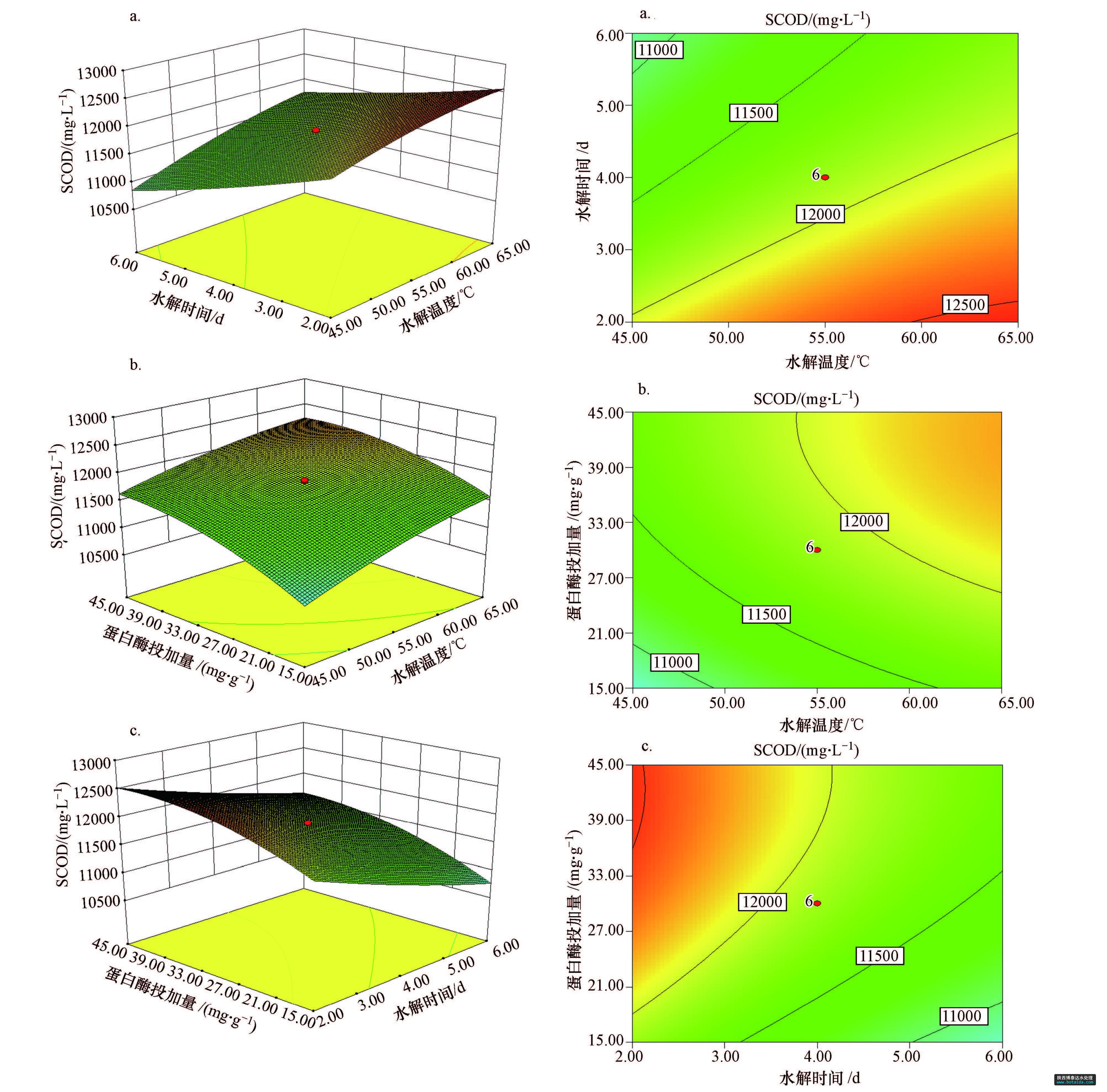圖2 不同因素對SCOD濃度影響的響應(yīng)曲面圖和等高線圖(a.水解酸化時間和水解溫度,b.蛋白酶投加量和水解溫度,c.蛋白酶投加量和水解酸化時間)