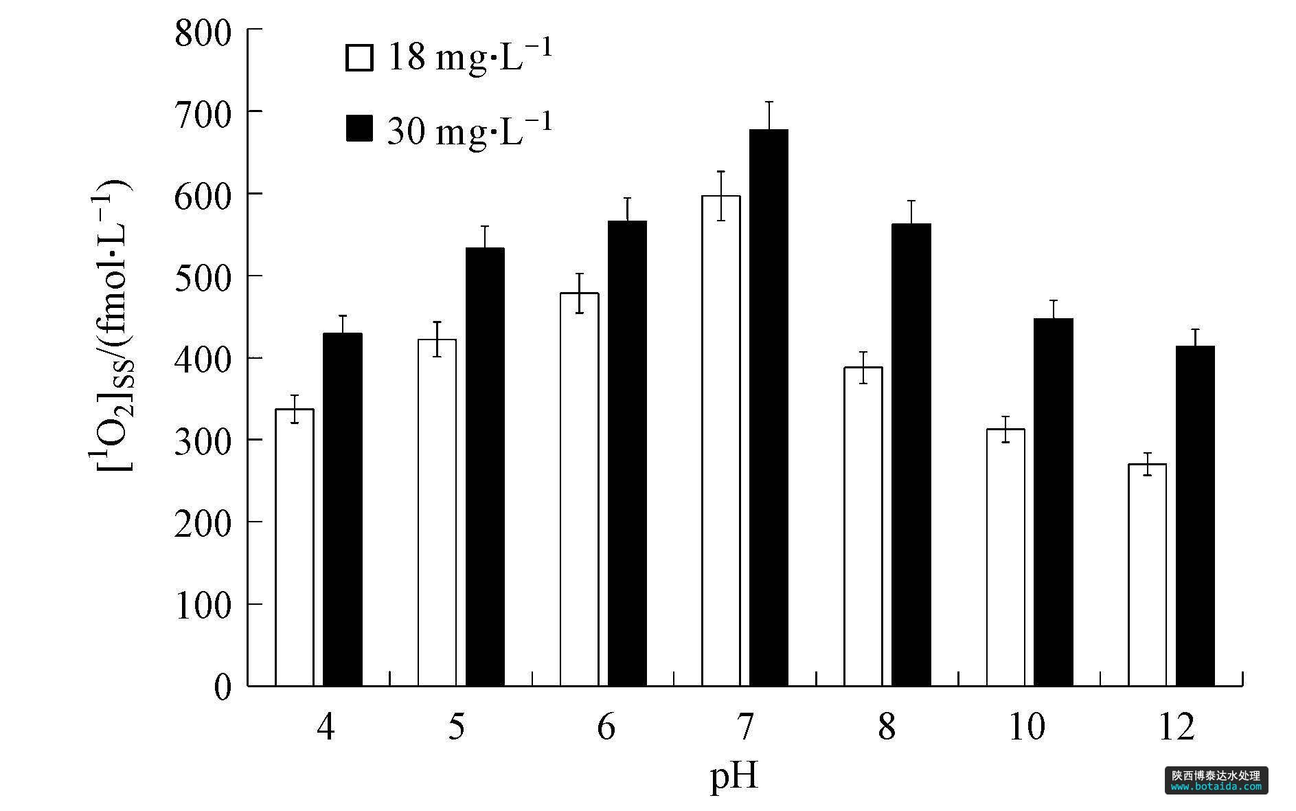 溶解性有機(jī)質(zhì)濃度(DOC)是溶解性有機(jī)質(zhì)產(chǎn)生1O2的重要影響因素,研究結(jié)果表明,[1O2]ss與DOC顯著線性相關(guān)(R2=0.95).由圖 2可知,本研究中同pH值下,DOC值高的腐殖酸溶液產(chǎn)生的1O2 均高于低DOC的溶液,但因未設(shè)置多個(gè)DOC濃度梯度實(shí)驗(yàn),本研究不能得到[1O2]ss與DOC的關(guān)系曲線.
