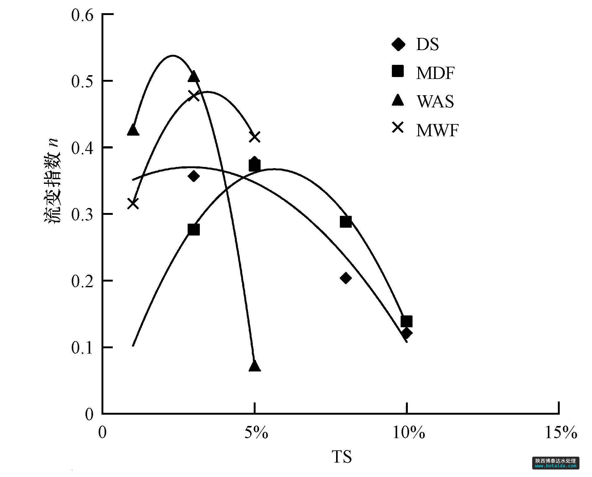 由圖 3可以看出,4種原料的流變指數(shù)均隨TS濃度升高而呈先升高后降低的趨勢,不同的是WAS和MWF是在TS=3%時流變指數(shù)最大,而DS和MDF是在TS=5%時流變指數(shù)最大.造成這種差異的原因可能是WAS和DS組成成分不同做造成的.WAS和MWF在TS=3%時更接近牛頓流體,說明在TS=3%時厭氧消化系統(tǒng)中傳質(zhì)和傳熱效果較好,有利于厭氧消化過程的進行.而對于DS和MDF而言,TS=5%時流變指數(shù)最大,同樣在這個濃度下也有利于物料的混合,這也從另一方面解釋了前期發(fā)酵試驗中在TS為5%濃度下MDF比MWF的產(chǎn)氣性能好的原因.