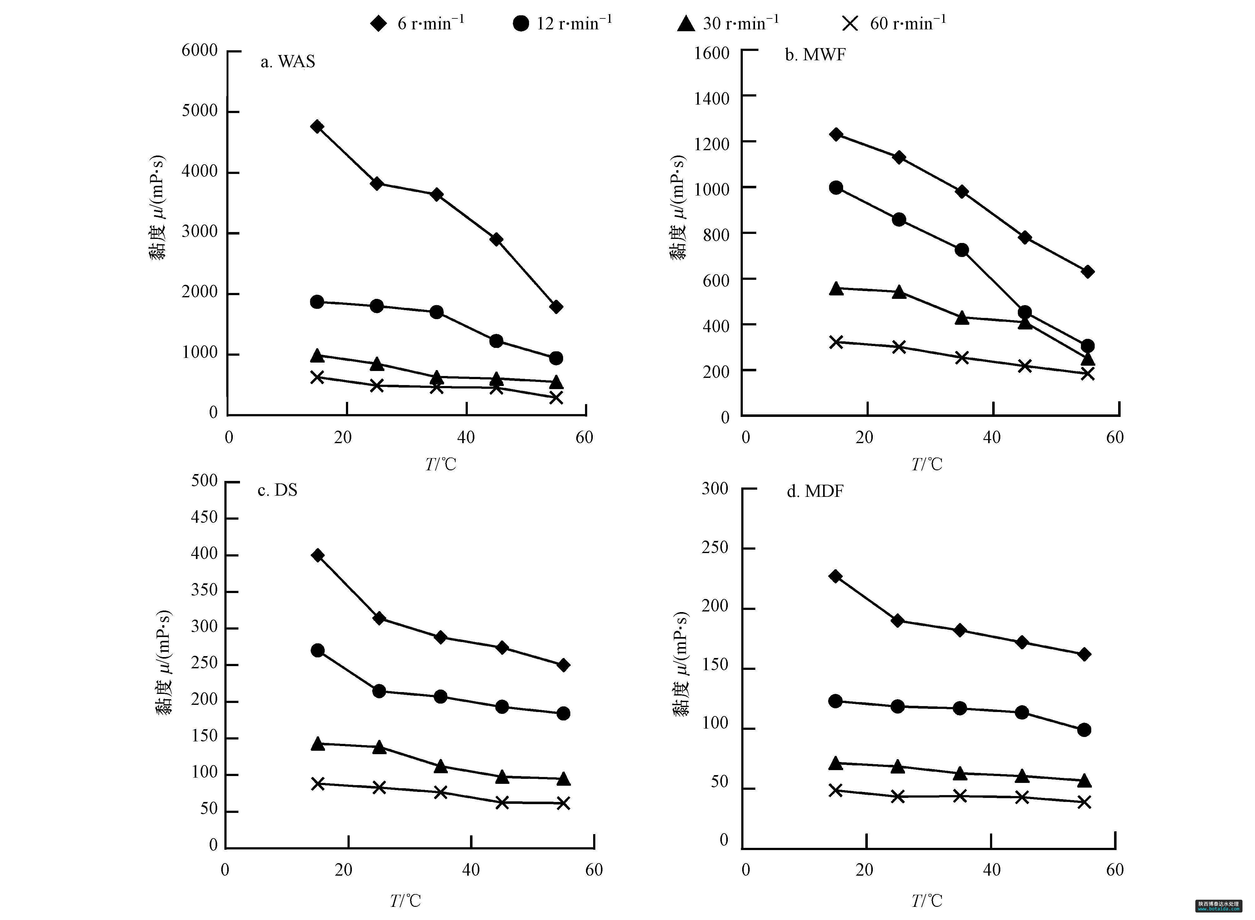 根據(jù)式(2),測定不同轉(zhuǎn)速條件下的原料黏度,由冪律方程擬合得到4種發(fā)酵原料的流變特性參數(shù),如表 1所示.流變指數(shù)n是衡量實際流體與牛頓流體相似程度的指標.當n為1時,此時流體為牛頓流體;n小于1時,流體為假塑性或者剪切變稀流體;n大于1時,流體為膨脹塑性或者剪切增稠流體.從表 1中可以看出,4種原料的流變指數(shù)n都小于1,在 TS 為 5%、溫度為35 ℃條件下都為假塑性流體(陳志平等,2004).造成這4種原料呈現(xiàn)明顯的假塑性流體性質(zhì)的原因可能是污泥主要由微生物聚集體(即活性污泥菌膠團)、廢水帶入的無機性沉渣、少量未降的有機物等大分子物質(zhì)和大量的水分組成,污泥混合液中大分子物質(zhì)的存在會使原料在受到剪切后發(fā)生分子的重排,分子趨向與流動方向一致,流動阻力下降,從而使表觀黏度在剪切速率增大時減小(劉刈等,2009).4種原料中WAS的流變指數(shù)最小,剩餐的最大,這說明在 TS 為 5%、溫度為35 ℃條件下4種原料中MWF的流變性質(zhì)最接近牛頓流體,而WAS偏離牛頓流體的程度最大.此外,4種原料中MDF的黏度最小,WAS的黏度最大,而流體稠度系數(shù)作為黏度的量度,使得通過擬合的得到的4種原料的流體稠度系數(shù)中MDF最小,WAS最大.