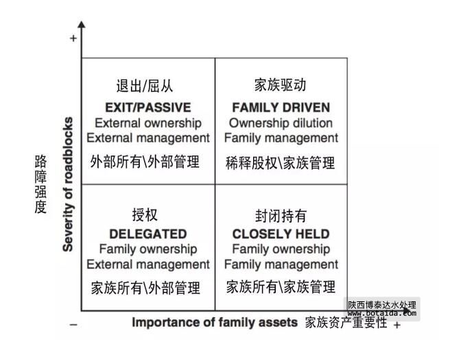 家族企業(yè)路線(xiàn)圖為家族可以選擇的路線(xiàn)提供了一個(gè)非常簡(jiǎn)明的圖解。通常,它能做出如下預(yù)測(cè):家族資產(chǎn)漸趨減少的企業(yè)應(yīng)該更多地尋求外部管理的介入,而目前以及未來(lái)面臨重大障礙的企業(yè),則應(yīng)該積極尋求所有權(quán)結(jié)構(gòu)的改革,以便將障礙可能造成的損失減小到最低。