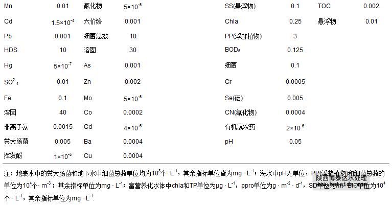 依照國家制訂的地表水環(huán)境質(zhì)量標(biāo)準(zhǔn)(GB3838— 2002)、地下水環(huán)境質(zhì)量標(biāo)準(zhǔn)(GB/14848—1993)、海水環(huán)境質(zhì)量標(biāo)準(zhǔn)(GB3097—1997)、適用于我國湖庫水體的富營養(yǎng)化標(biāo)準(zhǔn)及室外空氣環(huán)境質(zhì)量標(biāo)準(zhǔn)(GB3095—1996)和室內(nèi)空氣質(zhì)量標(biāo)準(zhǔn)(GB/T18883—2002),分別選取了4類水體的95項(xiàng)指標(biāo)(其中,地表水、地下水、海水和富營養(yǎng)化水體分別有24項(xiàng)、33項(xiàng)、23項(xiàng)和15項(xiàng)指標(biāo))和空氣的29項(xiàng)指標(biāo)(其中,室內(nèi)空氣15項(xiàng)指標(biāo)和室外空氣7項(xiàng)指標(biāo)的年、日2種不同分級標(biāo)準(zhǔn)情形)作為水環(huán)境和空氣環(huán)境的評價(jià)指標(biāo)體系.