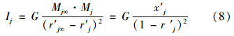 式中,Mj和Mj∞分別為指標(biāo)j的樣本“規(guī)范質(zhì)量”和“參照級”樣本“規(guī)范質(zhì)量”;r′j為指標(biāo)j的樣本的“規(guī)范坐標(biāo)”,顯然r′j=x′j;G為環(huán)境質(zhì)量引力常數(shù),其取值大小只是為了控制指數(shù)Ij的尺度范圍,對評價(jià)結(jié)果無任何影響,為簡單起見,在此取G=1.從而式(8)可表示為: