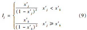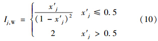 式中,Ij為由式(10)或式(11)計(jì)算得到的指標(biāo)j的引力指數(shù)值;wj為指標(biāo)j的歸一化權(quán)值,即滿足∑ m j=1 wj=1,它可以視實(shí)際問題需要,采用某種方法確定.一般情況下,只要各指標(biāo)的規(guī)范值x′j差異不大,可視各指標(biāo)為等權(quán)即可;但若最大指標(biāo)規(guī)范值x′j,max與最小指標(biāo)規(guī)范值x′j,min差異較大,則可采用如式(13)所示的對各指標(biāo)規(guī)范值x′j的線性加權(quán)計(jì)算權(quán)值.