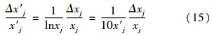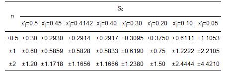 若n固定,將Sc對x′j求導(dǎo),并令S′c=0,得x′j=-1≈0.4142時(shí),Sc有極小值0.5828n.由于變換式(2)~(7)中,對多數(shù)指標(biāo)只取n=±2、±1、±0.5.而公式(10)和式(11)中,x′j 取值范圍為x′j∈[0,0.5](對水體),x′j∈[0,0.4](對空氣).當(dāng)n為上述值時(shí),x′j 分別取為如表 4所示值時(shí),由式(21)計(jì)算得靈敏度Sc值如表 4所示.