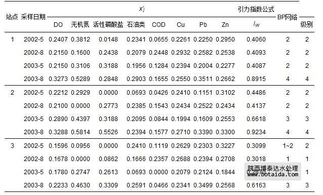 珠江口2002—2003年3個(gè)站點(diǎn)8項(xiàng)海水指標(biāo)監(jiān)測數(shù)據(jù)cj(李占東等,2005)如表 7所示.由式(1)和式(4)計(jì)算出的指標(biāo)規(guī)范值x′j如表 8所示.由于站點(diǎn)1的2003-8和站點(diǎn)2的2002-5,2002-8和2003-5樣本不同指標(biāo)的規(guī)范值x′j相差較大,因而需用式(13)對引力指數(shù)值進(jìn)行加權(quán)計(jì)算外.其余日期采樣點(diǎn)則視各指標(biāo)為等權(quán),再用式(10)和式(12)計(jì)算得到各站點(diǎn)海水水質(zhì)引力綜合指數(shù)值,并根據(jù)表 3中海水水質(zhì)引力指數(shù)分級標(biāo)準(zhǔn)做出評價(jià)結(jié)果(表 8).表中還列出文獻(xiàn)(李占東等,2005)中用BP人工神經(jīng)網(wǎng)絡(luò)評價(jià)法做出的評價(jià)結(jié)果.可以看出,全部12個(gè)樣本2種方法的評價(jià)級別完全一致.