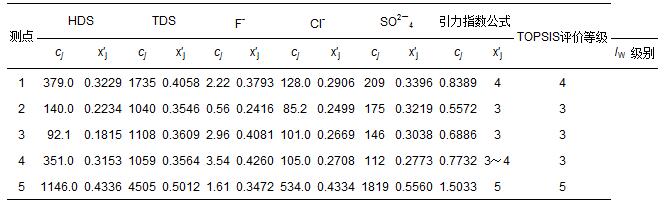 豐縣5個(gè)監(jiān)測點(diǎn)的5項(xiàng)地下水指標(biāo)監(jiān)測數(shù)據(jù)cj(劉洪等,2009),以及由式(1)和式(3)計(jì)算得到的指標(biāo)規(guī)范值x′j如表 6所示.在視各指標(biāo)為等權(quán)情況下,用式(10)和式(12)計(jì)算得到各監(jiān)測點(diǎn)水質(zhì)引力綜合指數(shù)的指數(shù)值,并根據(jù)表 3中3類陸地水體的綜合指數(shù)值分級標(biāo)準(zhǔn)做出水質(zhì)類別判斷結(jié)果(表 6).表中還列出文獻(xiàn)(劉洪等,2009)中用多屬性決策分析法(TOPSIS)做出的評價(jià)結(jié)果,可以看出,2種方法做出的評價(jià)結(jié)果完全一致.