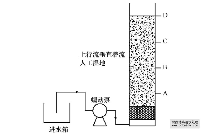 試驗(yàn)裝置模擬上行流垂直潛流人工濕地,裝置直徑15 cm,高100 cm,填料層高度80 cm,底部填充10 cm厚的礫石為布水區(qū)(圖 1).填料柱采用蠕動泵進(jìn)水,進(jìn)水以松花江富錦段微污染江水水質(zhì)為依據(jù)配水,水質(zhì)為COD 80~100 mg · L-1,NH+4-N 10~13 mg · L-1,NO-3-N 13~15 mg · L-1,TP 1.5~2.5 mg · L-1.水力負(fù)荷為2.65 mL · min-1,運(yùn)行時間為20周.系統(tǒng)穩(wěn)定運(yùn)行后,對填料層的不同深度進(jìn)行分析,考察不同填料段污染物在濕地中去除的規(guī)律,在填料20、40、60、80 cm處分別設(shè)置取樣口,編號分別為A(0~20 cm)、B(20~40 cm)、C(40~60 cm)、D(60~80 cm).