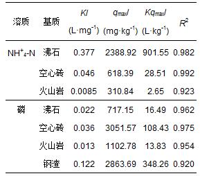 Langmuir等溫吸附模型中的K值為吸附結(jié)合能,K值越大,表示填料與溶質(zhì)的結(jié)合越穩(wěn)定.從表 4可以看出,各填料與NH+4-N之間的結(jié)合能大小順序?yàn)榉惺?gt;空心磚>火山巖;各填料與磷之間的結(jié)合能大小順序?yàn)殇撛?gt;空心磚>沸石>火山巖.Kqmax為最大緩沖容量,反映固液體系吸附溶質(zhì)時的緩沖能力(趙桂瑜,2007).將各填料進(jìn)行比較,對NH+4-N緩沖容量最大的填料為沸石,對磷緩沖容量最大的為鋼渣,空心磚次之.這說明即使溶液污染物濃度變化較大時,這些填料對相應(yīng)污染物仍能維持較好的去除效果.因此,沸石是較好凈化NH+4-N,鋼渣、空心磚是較好的凈化磷的人工濕地填料.