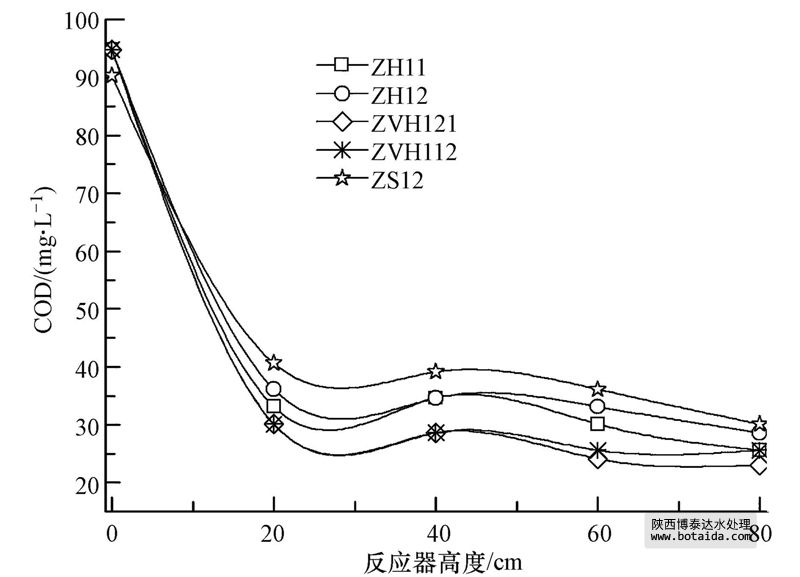 圖 3為運(yùn)行穩(wěn)定后,不同反應(yīng)器中COD沿豎直方向上的變化情況,在0~20 cm間,COD迅速下降,在20~80 cm間,COD則無顯著降低.COD沿反應(yīng)器豎直方向的變化與DO的變化相比較,說明污水在進(jìn)入反應(yīng)器后,DO被好氧微生物迅速利用用于COD的降解.而在大部分有機(jī)物被降解后,COD較低,同時因?yàn)樯锪?、pH等的影響,在反應(yīng)器頂部COD很難被進(jìn)一步降解.有研究人員在反應(yīng)器頂部加入曝氣裝置,其COD去除率要高于無曝氣反應(yīng)器(Ong et al., 2010).由于本研究進(jìn)水中COD偏低,且出水濃度也較低,為節(jié)約能耗,無需加入曝氣裝置.但遇到人工濕地處理高COD污水時,可在人工濕地中加入曝氣裝置,利于有機(jī)物更好地去除.