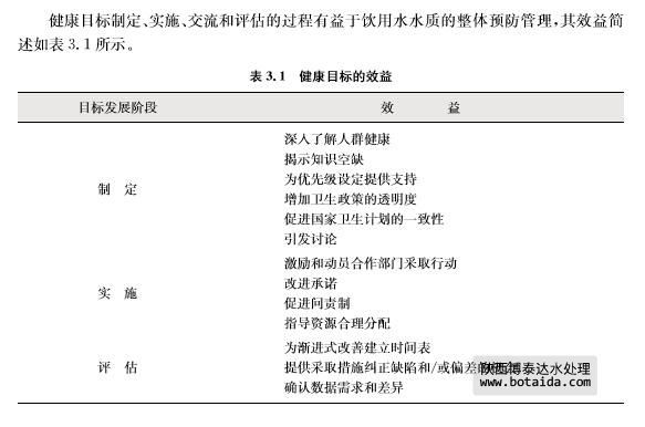 對于改善飲用水安全,資源分配的一個重要概念是在健全的風(fēng)險管理系統(tǒng)支持下,可能先 建立一個較為寬松的過渡目標(biāo),用來鼓勵飲用水質(zhì)量的漸進(jìn)式改進(jìn)。在這方面,健康目標(biāo)可以 作為支持和衡量水質(zhì)逐步改善的依據(jù)??梢酝ㄟ^制訂漸趨嚴(yán)格的健康目標(biāo)或通過演化出能更 準(zhǔn)確反映健康保護(hù)要求的健康目標(biāo),來促進(jìn)水質(zhì)的改善(例如從特定技術(shù)目標(biāo)到性能目標(biāo))。