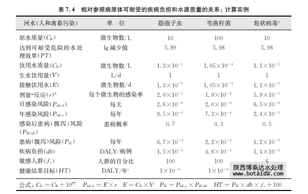 當(dāng)需將一個病例中發(fā)生特定疾病的風(fēng)險轉(zhuǎn)化為疾病負(fù)擔(dān)時,可以使用DALY(metric disabilityadjustedlifeyear)(見第3章3.1)。這不但反映了急性終點反應(yīng)(腹瀉),也反映了 死亡率和更嚴(yán)重的終點反應(yīng)(如與彎曲桿菌有關(guān)的格林 巴利綜合癥,即急性感染性多發(fā)神 經(jīng)炎)。每個病例的疾病負(fù)擔(dān)變化很大。例如,每1000例輪狀病毒的疾病負(fù)擔(dān)在低收入地 區(qū)為480DALYs,而且還經(jīng)常發(fā)生兒童死亡。但在大多數(shù)居民都能得到醫(yī)療救助的高收入 地區(qū)僅為14DALYs/1000例(見附錄1支持性文件《世界衛(wèi)生組織飲用水水質(zhì)準(zhǔn)則中公共 衛(wèi)生風(fēng)險量化》)。由于這種疾病負(fù)擔(dān)上的明顯差別,為了要達(dá)到相同的危險程度(以 DALYs/人/年表示),在相同水源質(zhì)量的情況下,在低收入地區(qū)就需要實施更嚴(yán)格的水處 理。表7.4中10-6DALY/人/年這樣的健康結(jié)果目標(biāo)最好能與具體國情相結(jié)合。表7.4中 沒有免疫缺陷人群的計算數(shù)值(如 HIV/AIDS患者中的隱孢子蟲病),在某些國家,這些人群的數(shù)量還是很多的。3.2節(jié)中有更多關(guān)于DALY的信息,及關(guān)于如何將其用于獲取風(fēng)險 參考值。