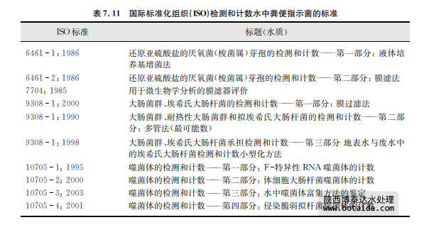 國際標(biāo)準(zhǔn)方法在被采納之前應(yīng)根據(jù)當(dāng)?shù)氐木唧w情況進行評估。可以使用已建立的標(biāo)準(zhǔn) 方法,如國際標(biāo)準(zhǔn)化組織(ISO)(見表7.11)的方法或效果及可靠性與其相當(dāng)?shù)姆椒ň刹?用。對于常規(guī)檢測可采用那些已建立的方法。無論選用何種方法檢測埃希氏大腸桿菌或耐 熱性大腸菌群,都必須考慮因環(huán)境或消毒劑受到損傷的微生物菌株的“復(fù)蘇”或“恢復(fù)”問題。