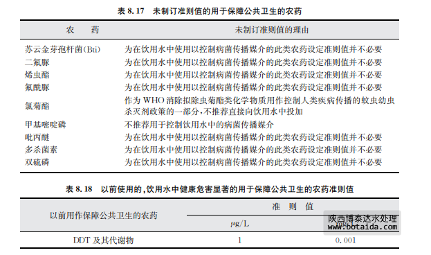 表8.17列舉了尚未制訂準則值用于保障公共衛(wèi)生的農(nóng)藥。二氯二苯基三氯乙烷 (DDT)在過去常被使用以保障公共衛(wèi)生,現(xiàn)在在某些地區(qū)將DDT再次引入以控制攜帶瘧疾 的蚊蟲(但不應用在飲用水領域)。表8.18列出了DDT的準則值。表8.19列舉了各種殺 蟲劑產(chǎn)品的劑型,投量比和相應的攝入量。 準則中所涉及的殺幼蟲劑的資料概覽詳見第12章