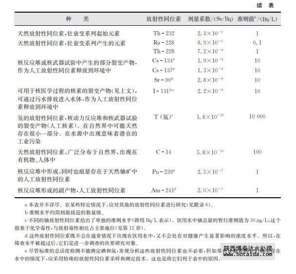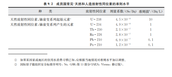 從放射學(xué)的角度,超過準(zhǔn)則值的程度也是一個需要考慮的關(guān)鍵問題。防護電離輻射和輻 射源安全的國際基本安全標(biāo)準(zhǔn)在有關(guān)現(xiàn)有暴露的章節(jié)提到了飲用水并提出由使用飲用水帶來 的個人年最高輻射劑量最大不能超過約1mSv②。這一水平不應(yīng)被當(dāng)作“可接受的”水平或限 制性水平,并應(yīng)盡可能地采取有效措施減少受到的輻射水平。每種超過準(zhǔn)則水平的情況不同, 在做出最后的決定之前還需要考慮一些非放射方面的因素(如補救措施的經(jīng)濟成本、其他供水 源的實用性)。政府的有關(guān)部門應(yīng)意識到,放射性同位素(如鈾)同時具有化學(xué)毒性,那么在水 中的允許濃度可能需要以其同位素的毒性確定,而不是依據(jù)放射性(見第12章)。