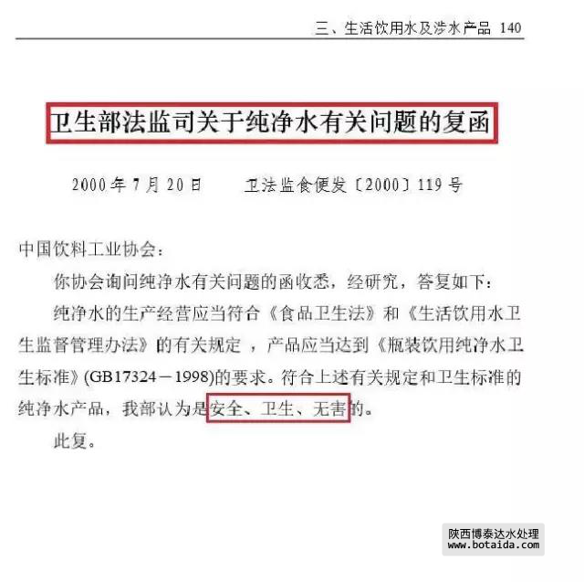2000年7月20日,衛(wèi)生部衛(wèi)生法制與監(jiān)督司在給中國飲料工業(yè)協(xié)會的復(fù)函中說,純凈水“是安全,衛(wèi)生,無害的”。