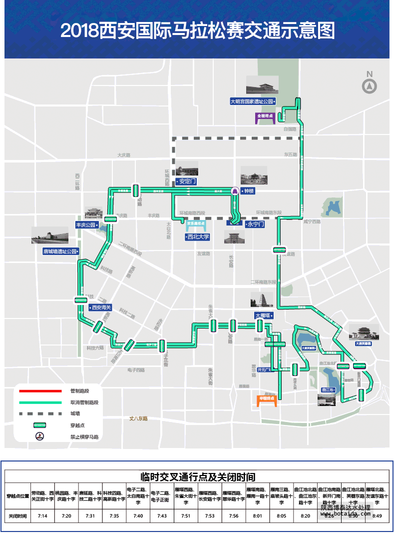 此次西安國(guó)際馬拉松的3項(xiàng)比賽起點(diǎn)均設(shè)在永寧門,為配合大賽舉辦,根據(jù)組委會(huì)要求,比賽當(dāng)日地鐵二號(hào)線永寧門站將延遲至上午10點(diǎn)開(kāi)站,自地鐵運(yùn)營(yíng)開(kāi)始至10時(shí),列車在永寧門站不停站通過(guò),前往永寧門站的乘客可從相鄰的鐘樓站或南稍門站進(jìn)出車站,由此給廣大乘客出行帶來(lái)的不便,請(qǐng)大家給予理解與支持。