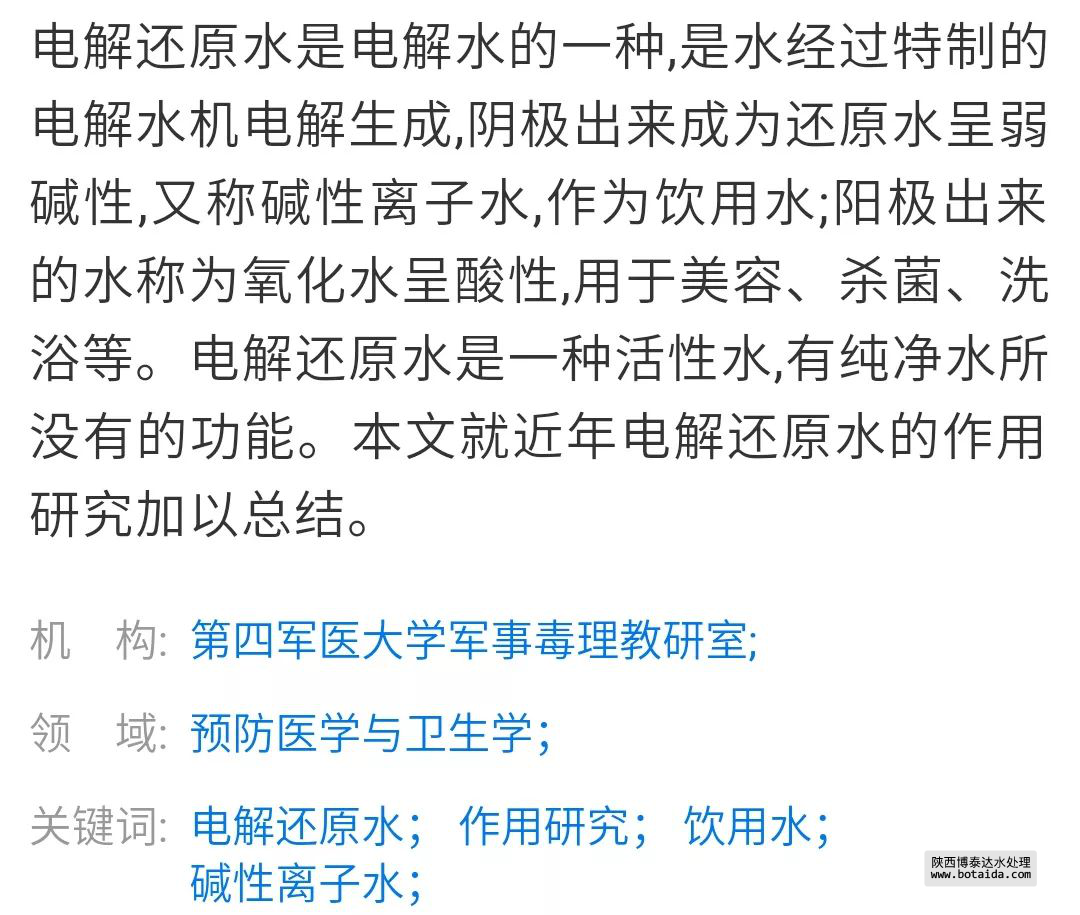 通常情況下,電解還原水是由普通的自來凈化水,然后通過陰陽電極,在電場的作用下將水分子團(tuán)打散、變小、重新排列,使水分子的結(jié)構(gòu)發(fā)生改變,使其中一部分水的氧化還原電位呈正值,另一部分水的氧化還原電位呈負(fù)值,最后通過膜分離技術(shù)得到電解還原水,使之具有醫(yī)療保健作用.