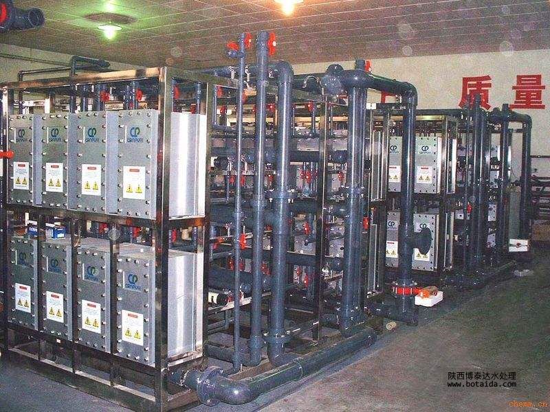 此設備將電滲析技術和離子交換技術融為一體。通過離子膜對水中離子進行選擇,再通過交換樹脂對離子進行交換,從而在電場的作用下實現(xiàn)水中離子的定向遷移,以達到到水的深度凈化除鹽并使樹脂進行連續(xù)再生的過程。