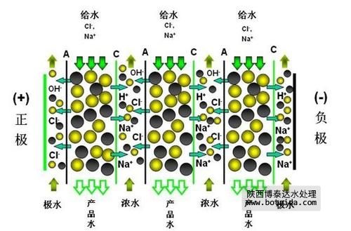 帶負(fù)電荷的陰離子(例如OH-、Cl-)被正極(+)吸引而通過陰離子交換膜,進(jìn)入到鄰近的濃水室。此后這些離子在繼續(xù)向正極遷移中遇到鄰近的陽離子交換膜,而陽離子交換膜不允許陰離子通過,這些離子即被阻隔在濃水中。淡水流中的陽離子(例如Na+ 、H+)以類似的方式被阻隔在濃水室。在濃水室,透過陰陽膜的離子維持電中性。
