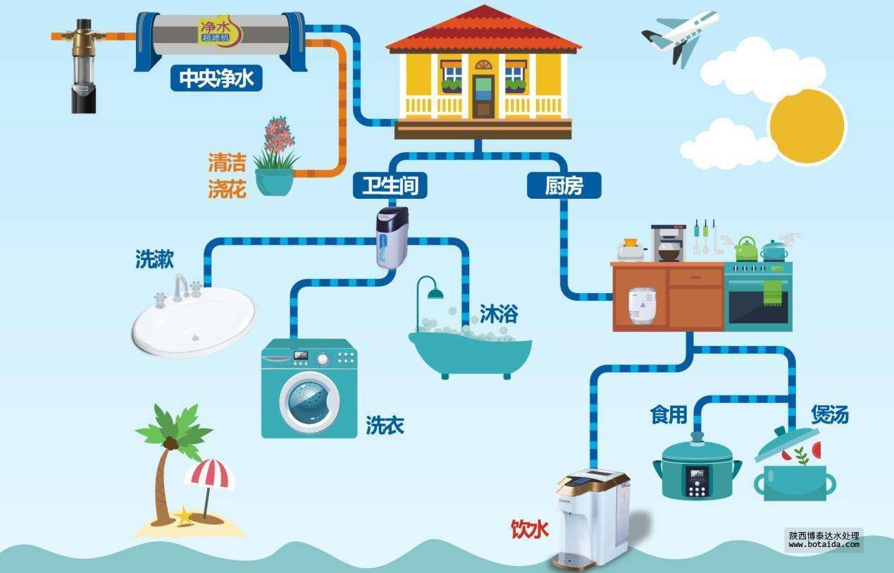 由中央凈水器處理后的凈水,分管流向廚房、衛(wèi)生間、客廳等各個房間。