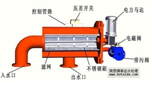 待處理的水由入水口進(jìn)入機(jī)體,水中的雜質(zhì)沉積在不銹鋼濾網(wǎng)上,由此產(chǎn)生壓差。通過(guò)壓差開(kāi)關(guān)監(jiān)測(cè)進(jìn)出水口壓差變化,當(dāng)壓差達(dá)到設(shè)定值時(shí),電控器給水力控制閥、驅(qū)動(dòng)電機(jī)信號(hào),引發(fā)下列動(dòng)作:電動(dòng)機(jī)帶動(dòng)刷子旋轉(zhuǎn),對(duì)濾芯進(jìn)行清洗,同時(shí)控制閥打開(kāi)進(jìn)行排污,整個(gè)清洗過(guò)程只需持續(xù)數(shù)十秒鐘,當(dāng)清洗結(jié)束時(shí),關(guān)閉控制閥,電機(jī)停止轉(zhuǎn)動(dòng),系統(tǒng)恢復(fù)至其初始狀態(tài),開(kāi)始進(jìn)入下一個(gè)過(guò)濾工序。