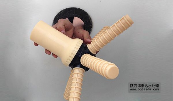 二、將轉(zhuǎn)接頭和蘑菇頭以及布水器支管散件通過(guò)開(kāi)口先放入罐體內(nèi),在罐內(nèi)將布水器支管轉(zhuǎn)緊 。