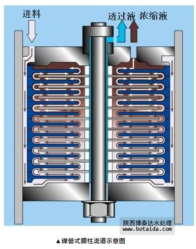 碟管式膜組件具有專利的流道設計形式,采用開放式流道,料液通過入口進入壓力容器中,從導流盤與外殼之間的通道流到組件的另一端,在另一端法蘭處,料液通過8個通道進入導流盤中,被處理的液體以最短的距離快速流經(jīng)過濾膜,然后180°逆轉到另一膜面,再從導流盤中心的槽口流入到下個導流盤,從而在膜表面形成由導流盤圓周到圓中心,再到圓周,再到圓中心的雙”S”形路線,濃縮液最后從進料端法蘭處流出。