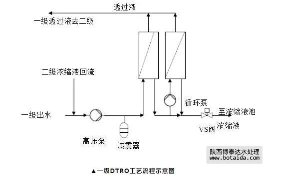 經(jīng)過芯式過濾器的原水直接進入一級反滲透高壓柱塞泵,DT膜系統(tǒng)每臺柱塞泵后邊都有一個減震器,用于吸收高壓泵產(chǎn)生的壓力脈沖,給膜柱提供平穩(wěn)的壓力。經(jīng)高壓泵后的出水進入膜組件,膜組件采碟管式反滲透膜柱,抗污染性強,物料交換效果好的優(yōu)點,對滲瀝液的適應性很強,一級DTRO膜壽可達3年以上,二級DTRO膜壽命長達5年。一級反滲透系統(tǒng)擬設兩組,為串聯(lián)連接方式,第一組反滲透的濃液進入串聯(lián)后置的第二組,各組處理的濃液COD濃度及鹽含量依次增加。二級反滲透設一組。