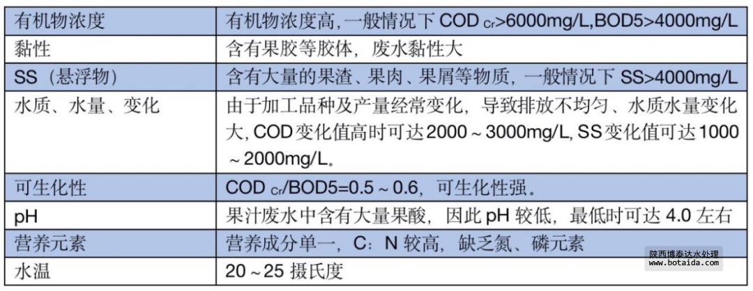 果汁廢水主要來自沖洗水果、粉碎、榨汁等工序,罐裝工段的洗瓶、滅菌、破瓶損耗和地、面沖洗等環(huán)節(jié)。廢水中含有較高濃度的糖類、果膠、果渣及水溶物和纖維素、果酸、單寧、 礦物鹽等。