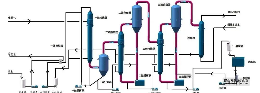 三組蒸發(fā)器以串聯(lián)的形式運行,組成三效結(jié)晶蒸發(fā)器。整套蒸發(fā)系統(tǒng)采用連續(xù)進料、連續(xù)出料的生產(chǎn)方式。高含鹽廢水首先進入一效強制循環(huán)結(jié)晶蒸發(fā)器,結(jié)晶蒸發(fā)器配有循環(huán)泵,將廢水打人蒸發(fā)換熱室,在蒸發(fā)換熱室內(nèi),外接蒸氣液化產(chǎn)生汽化潛熱,對廢水進行加熱。由于蒸發(fā)換熱室內(nèi)壓力較大,廢水在蒸發(fā)換熱室中在高于正常液體沸點壓力下加熱至過熱.加熱后的液體進入結(jié)晶蒸發(fā)室后,廢水的壓力迅速下降導致部分廢水閃蒸,或迅速沸騰。廢水蒸發(fā)后的蒸氣進人二效強制循環(huán)蒸發(fā)器作為動力蒸氣對二效蒸發(fā)器進行加熱,未蒸發(fā)廢水和鹽分暫存在結(jié)晶蒸發(fā)室。一效、二效、三效強制循環(huán)蒸發(fā)器之間通過平衡管相通,在負壓的作用下,高含鹽廢水由一效向二效、三效依次流動,廢水不斷地被蒸發(fā),廢水中鹽的濃度越來越高,當廢水中的鹽分超過飽和狀態(tài)時,水中鹽分就會不斷地析出,進入蒸發(fā)結(jié)晶室的下部的集鹽室.吸鹽泵不斷將含鹽的廢水送至旋渦鹽分離器,在旋渦鹽分離器內(nèi),固態(tài)的鹽被分離進入儲鹽池,分離后的廢水進入二效強制循環(huán)蒸發(fā)器加熱,整個過程周而復始,實現(xiàn)水與鹽的最終分離.