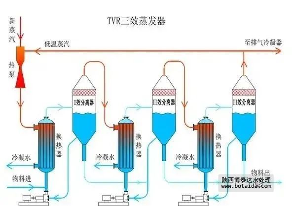 MVR蒸發(fā):MVR蒸發(fā)器由加熱器、分離器、預熱器、蒸汽壓縮機、泵組、稠厚器、母液罐、離心機、電氣儀表控制及閥門、管路等組成。